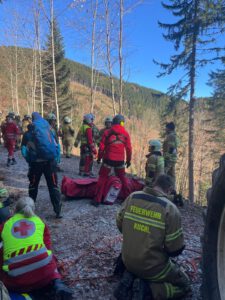 Bereits am frühen Freitagvormittag folgte der nächste Einsatz für die Bergrettung Hallein: Ein schwerverletzter Holzarbeiter musste nach einem Arbeitsunfall im Raum Kuchl erstversorgt, abtransportiert und einem Rettungshubschrauberteam übergeben werden.