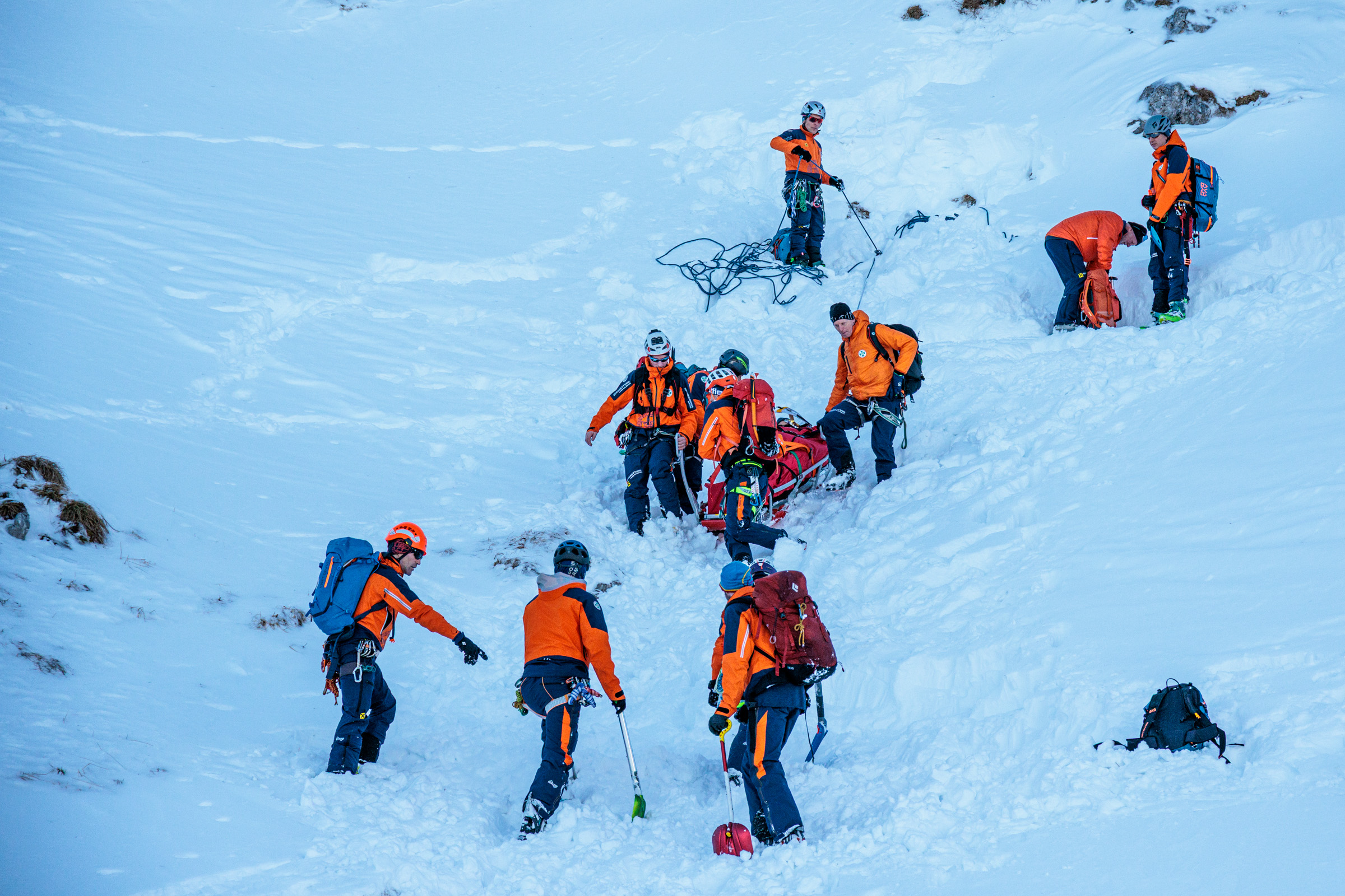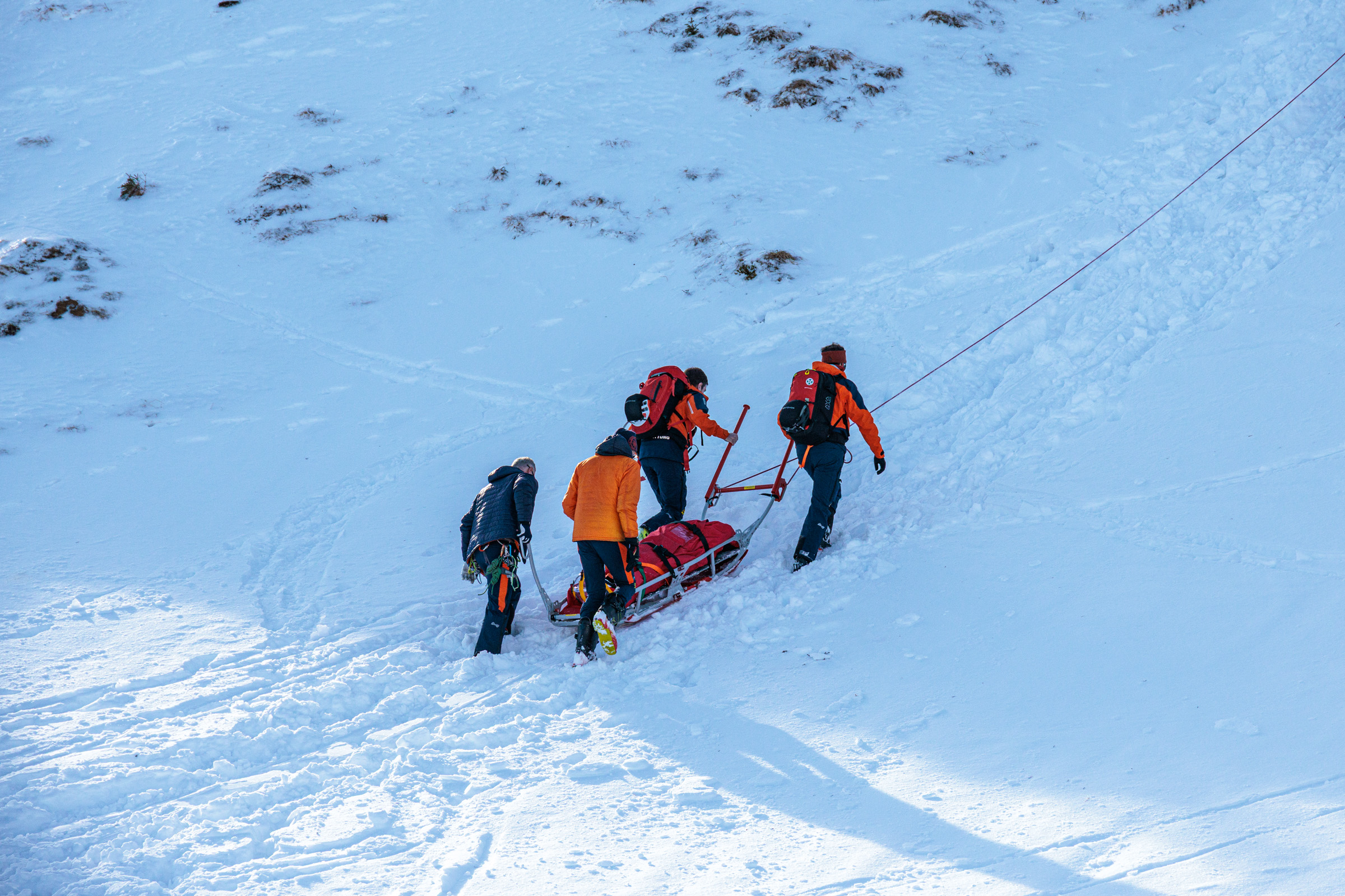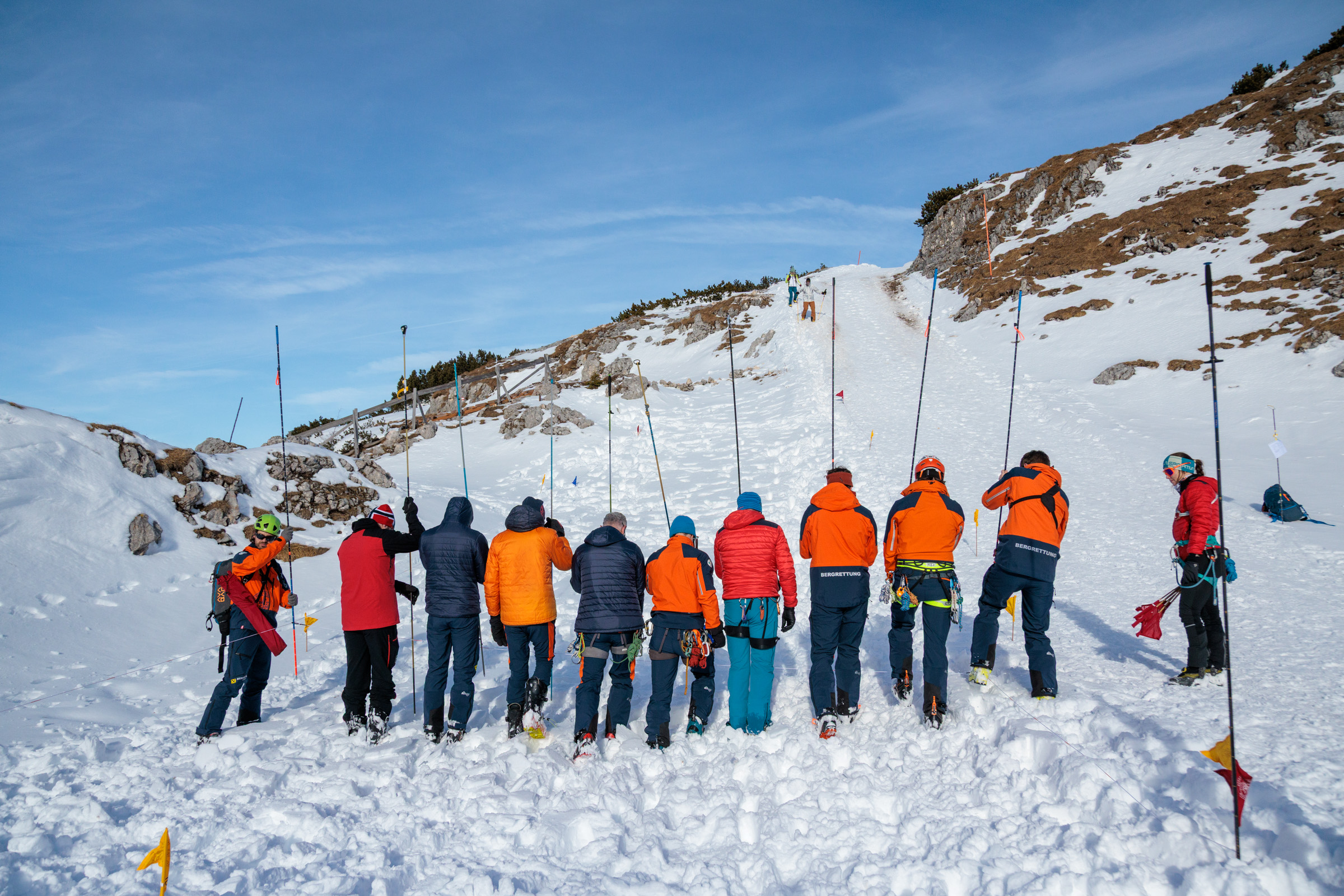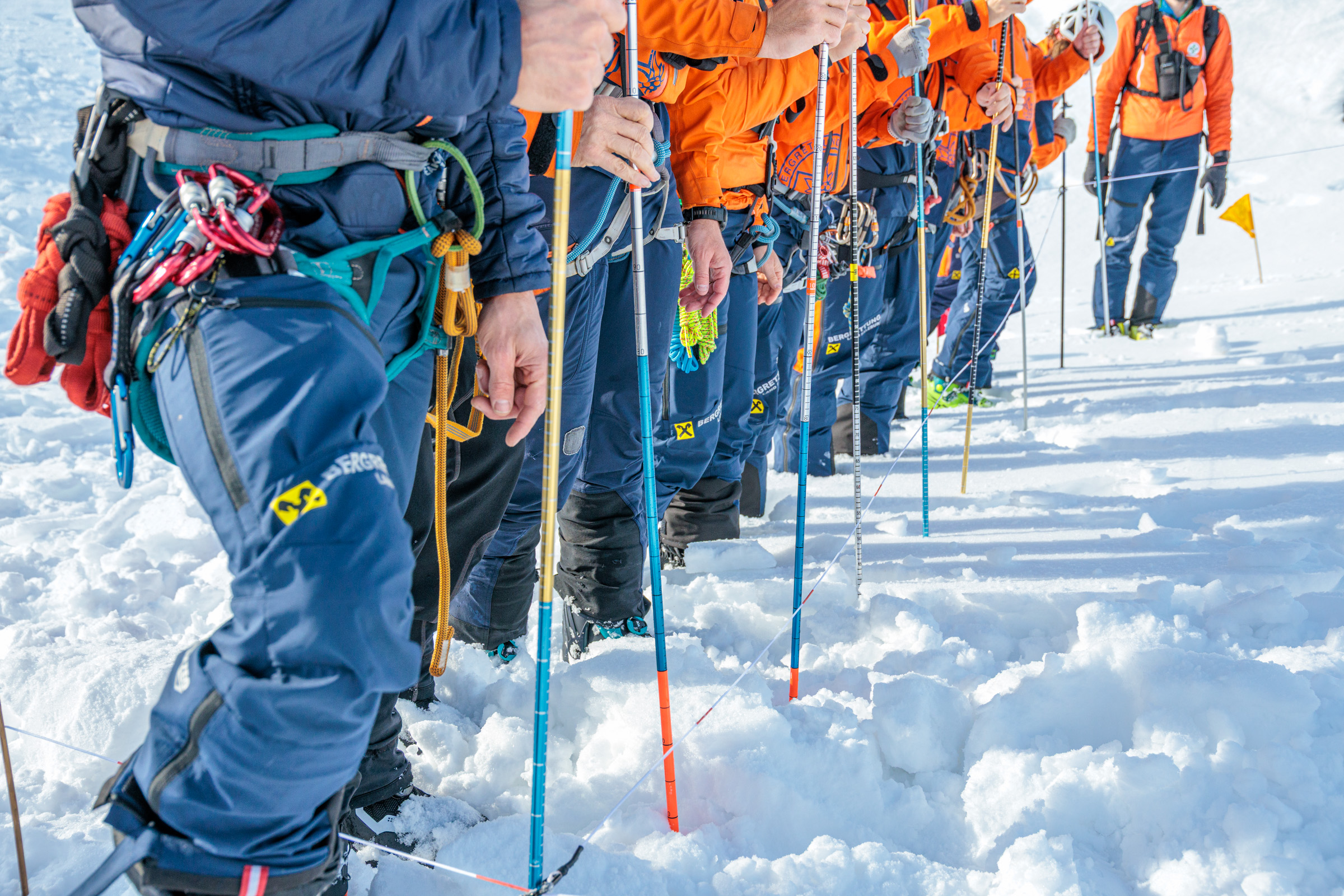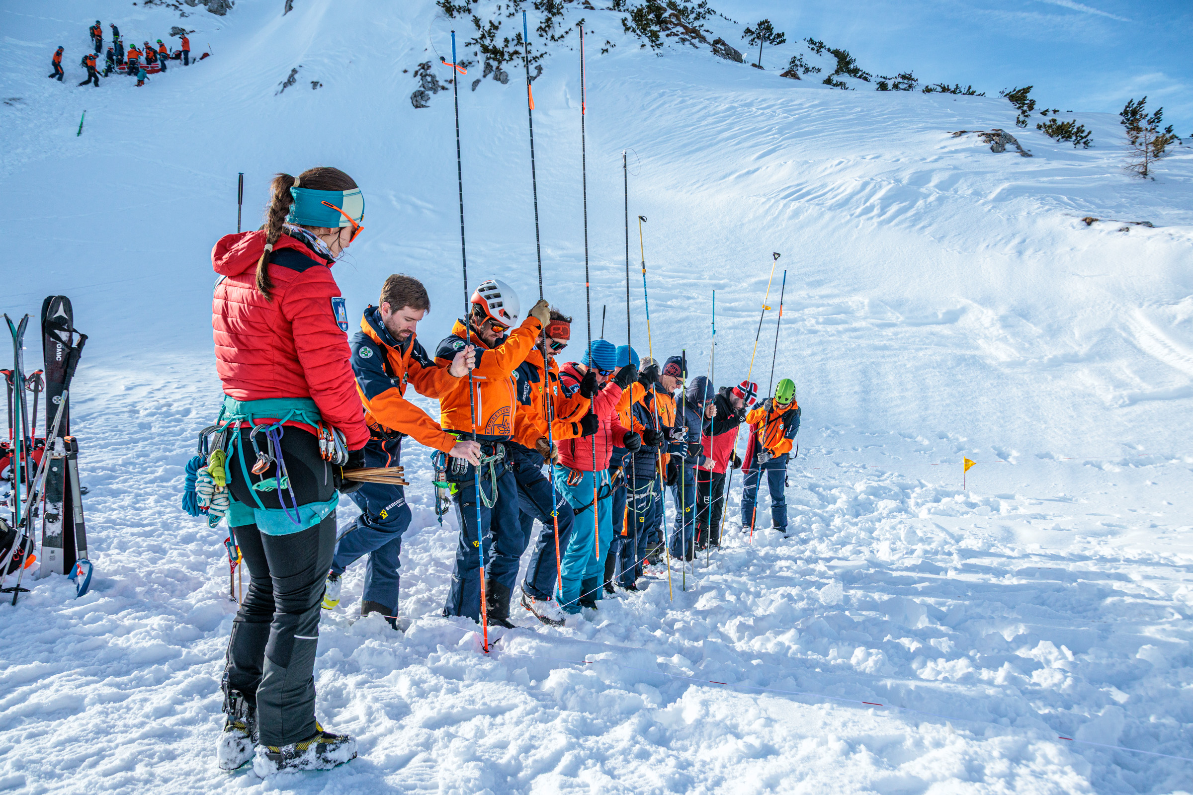 An insgesamt sechs Stationen wurden unterschiedliche Einsatzszenarien durchgespielt. Dazu zählten unter anderem die Erstversorgung von Verletzten, der Umgang mit LVS-Geräten, das RECCO-System, Handhabung Alpintrage mit Schlittensystem – gestaffeltes Abseilen, die planmäßige Sondierung nach einem Lawinenabgang sowie Maßnahmen zum Wärmeerhalt von Verunfallten. Alle geplanten Szenarien konnten erfolgreich und realitätsnah abgearbeitet werden.