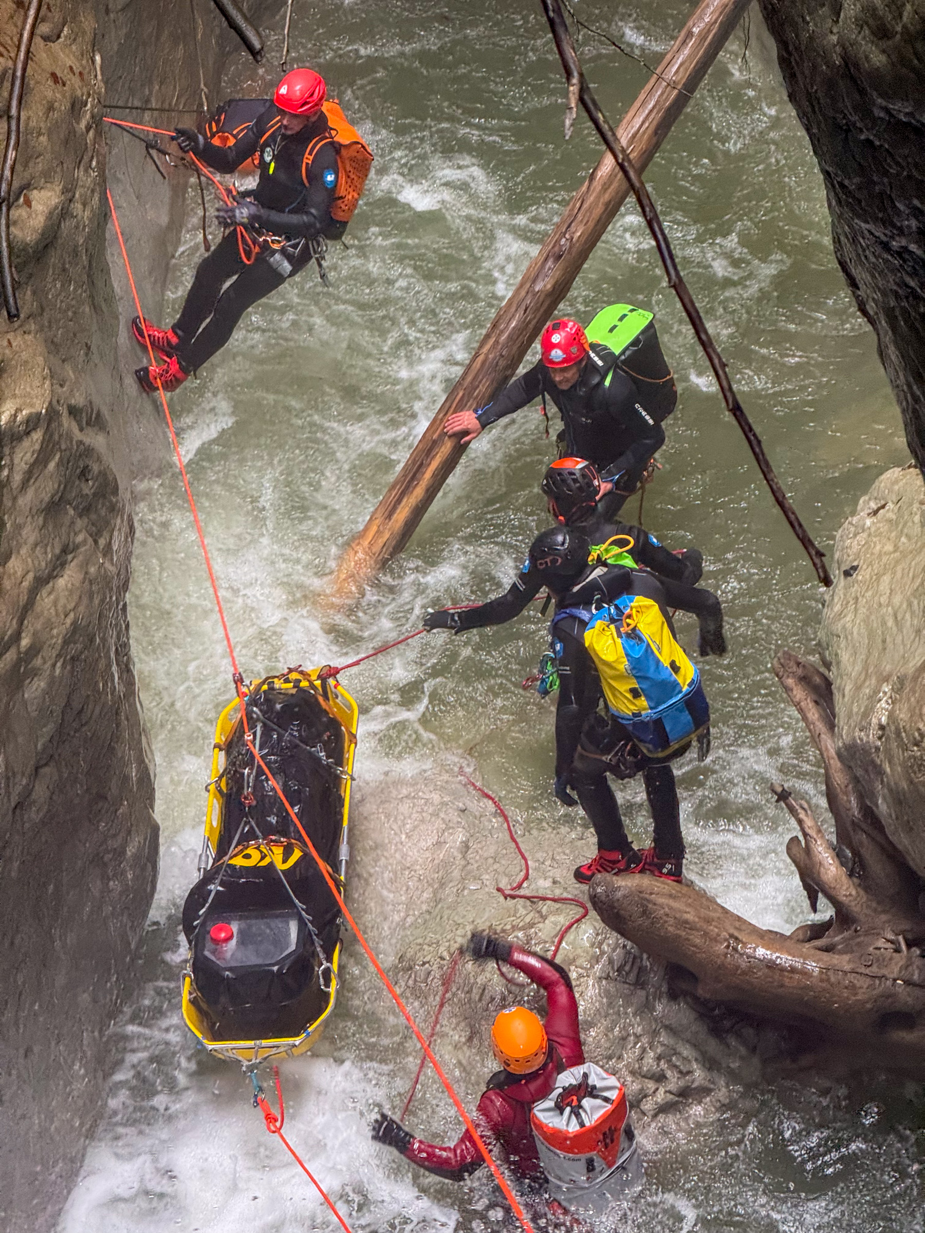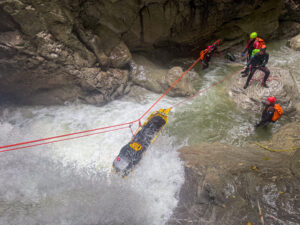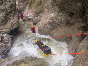Im Mittelpunkt standen die Verwendung und der praktische Einsatz der Trage „Kong 911 Canyon“. Nach einer gemeinsamen Begehung einer Schlucht konnten die verschiedenen Rettungstechniken mit der Trage im Gelände aktiv erprobt werden. Dabei bot sich die Gelegenheit, unterschiedliche Herangehensweisen kennenzulernen, Erfahrungen zu teilen und voneinander zu lernen.