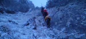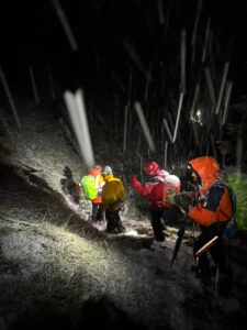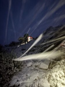 Eine hereinbrechende Kaltfront traf die Gruppe mit voller Wucht – Sturmböen, eisiger Schneefall und rasch einsetzende Dunkelheit behinderten den Abstieg.